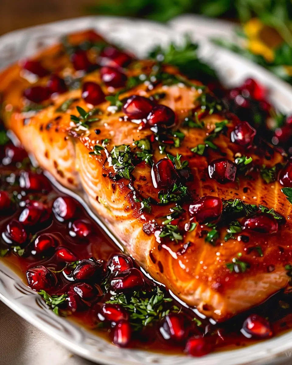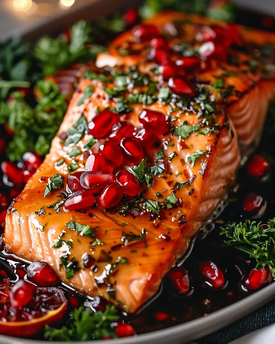 Enjoy a delicious and festive dish with this Christmas Salmon topped with a sweet and tangy pomegranate glaze, perfect for holiday gatherings.