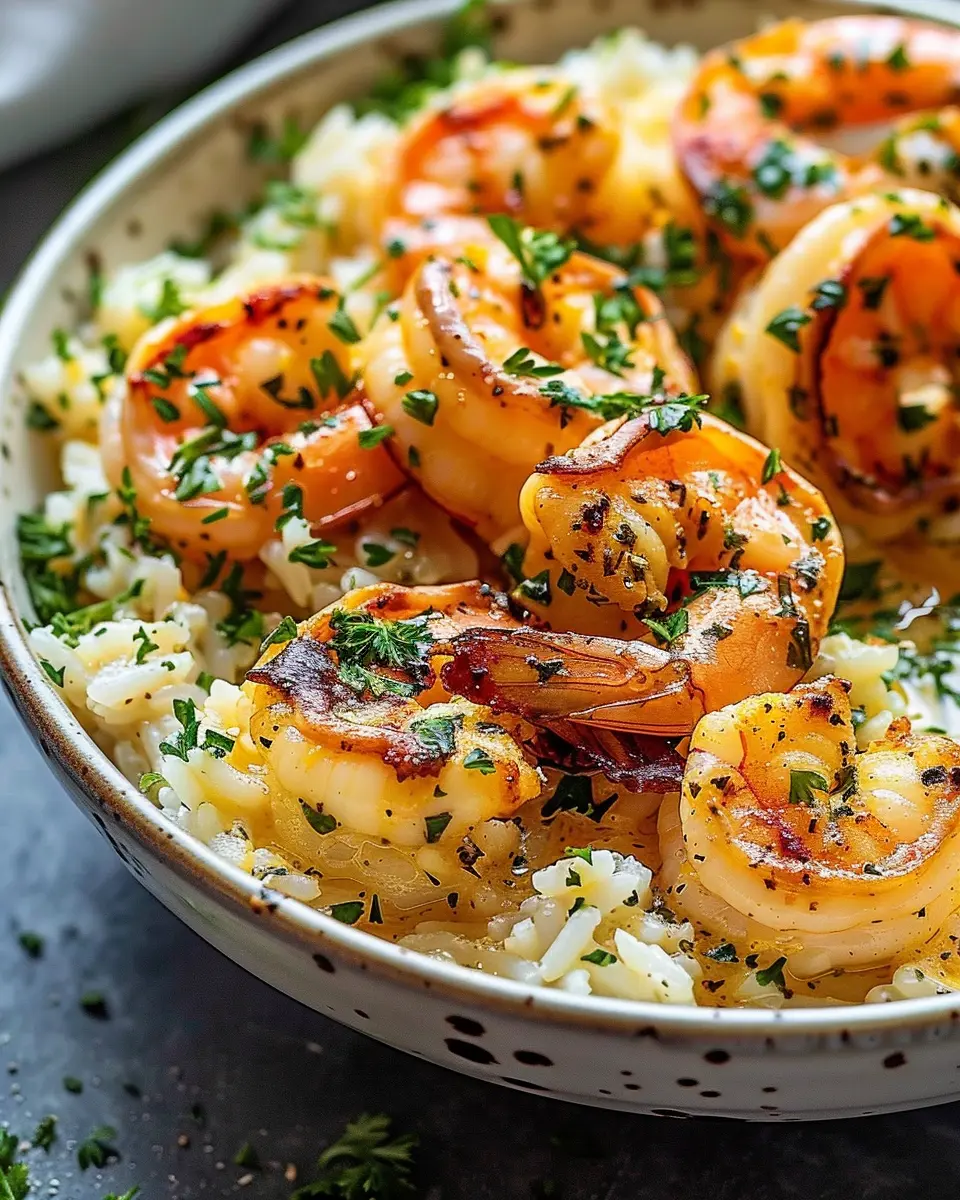 Indulge in a comforting bowl of creamy herb rice topped with succulent garlic butter shrimp.