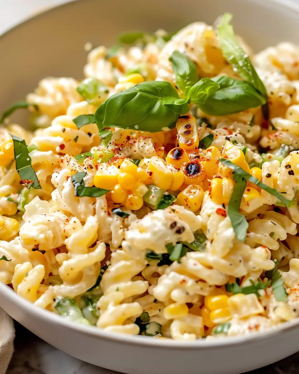 This creamy street corn pasta salad is the perfect side dish for summer barbecues and gatherings, combining sweet corn, creamy dressing, and fresh herbs.