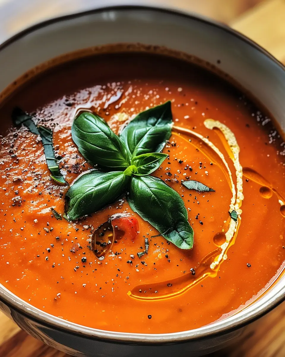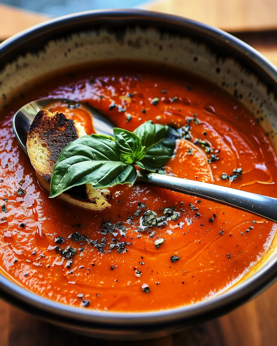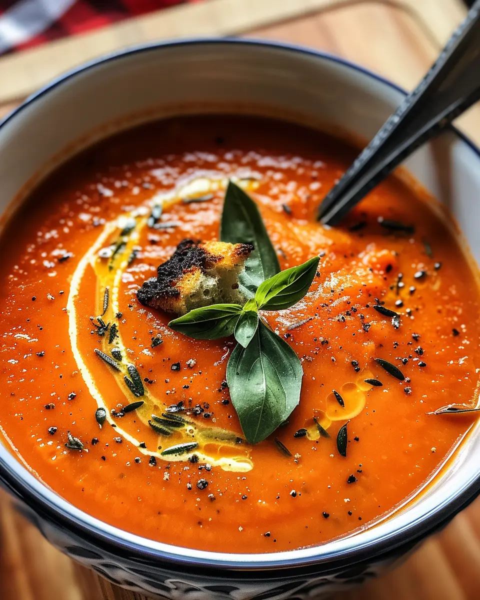 A warm and comforting roasted tomato soup that brings cozy vibes to your kitchen.
