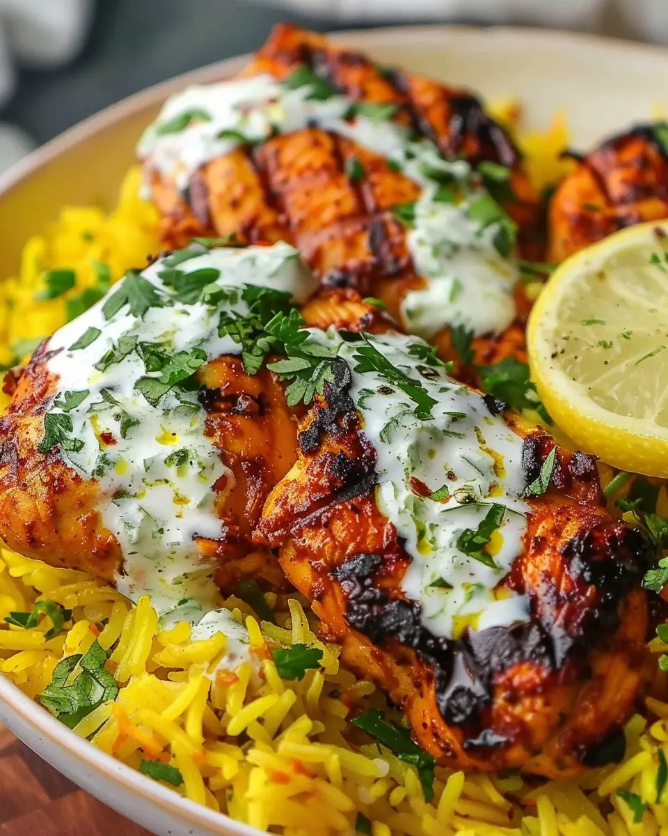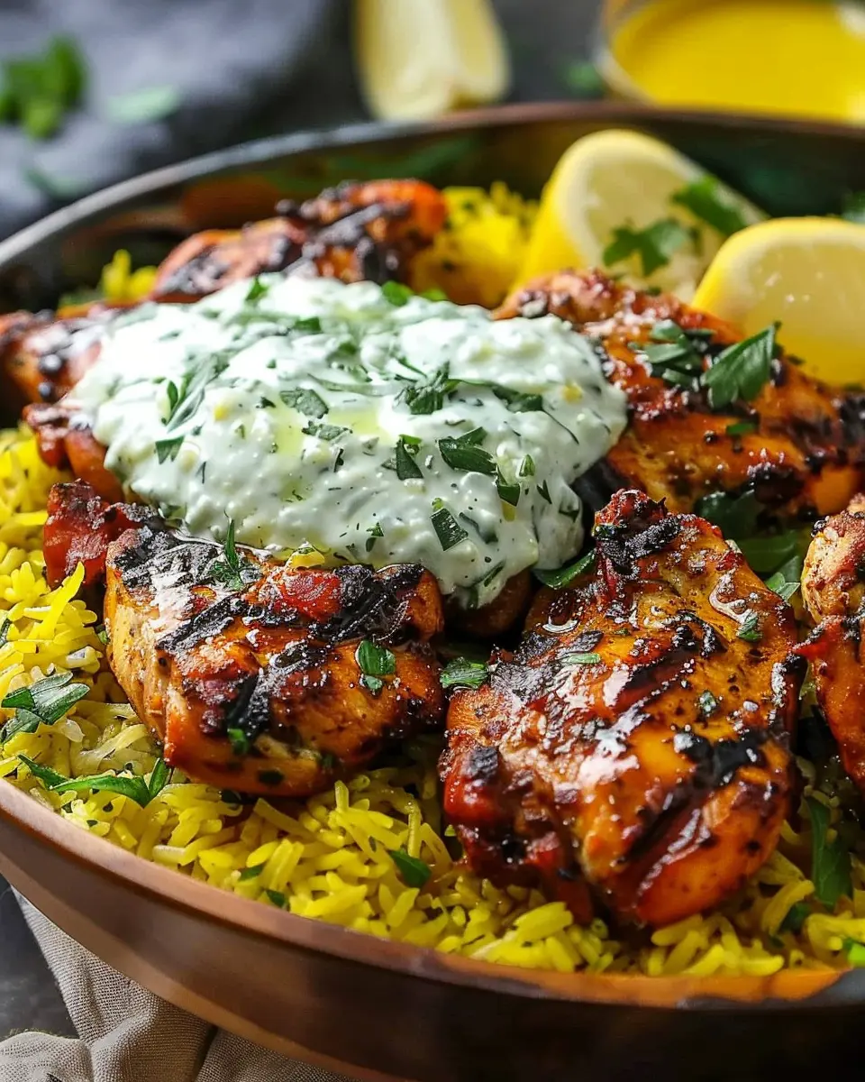 Delicious grilled chicken served over fragrant saffron rice, topped with a creamy herb yogurt sauce.