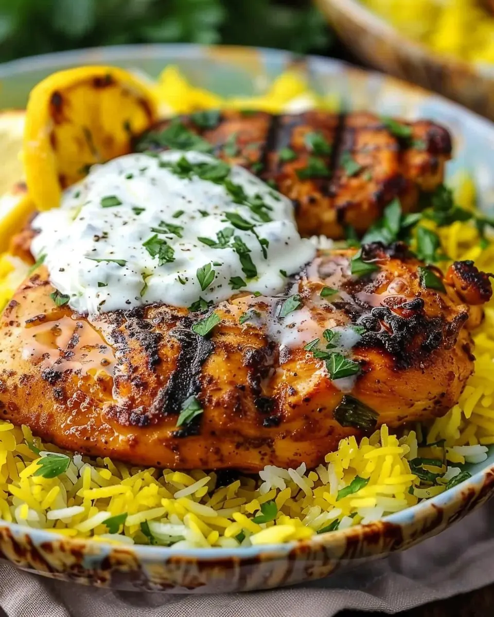 A creamy herb yogurt sauce complements the dish beautifully, adding a cooling contrast to the grilled chicken.
