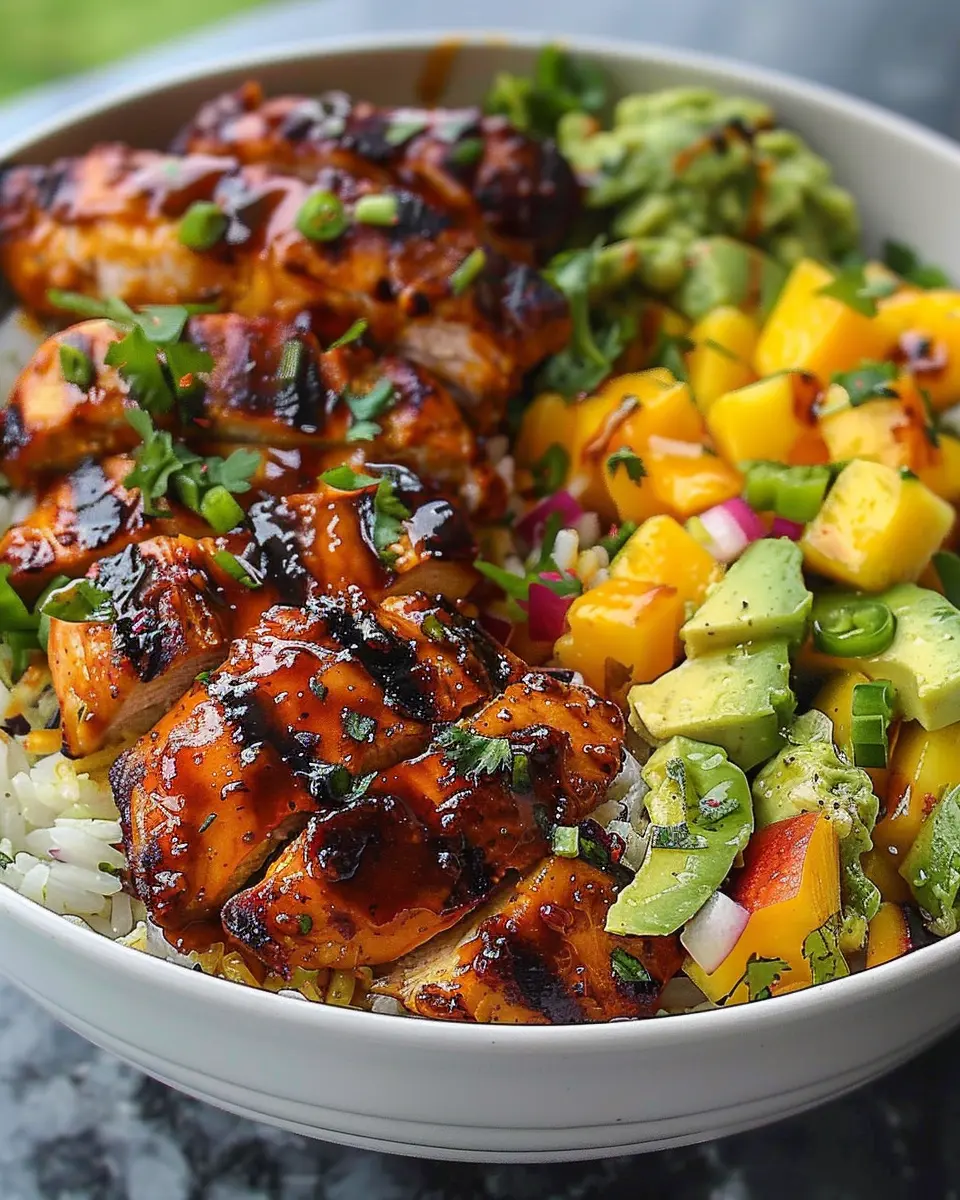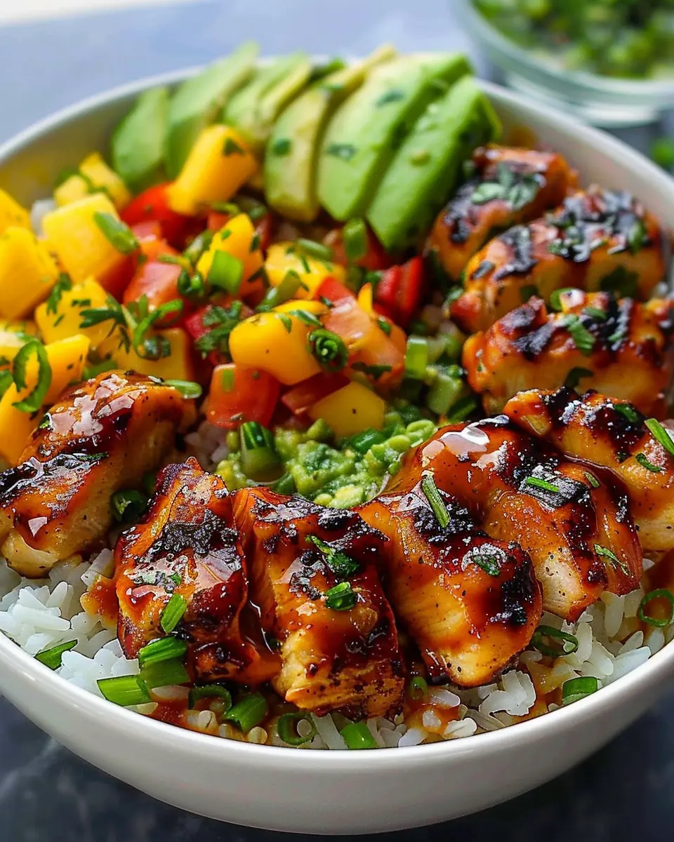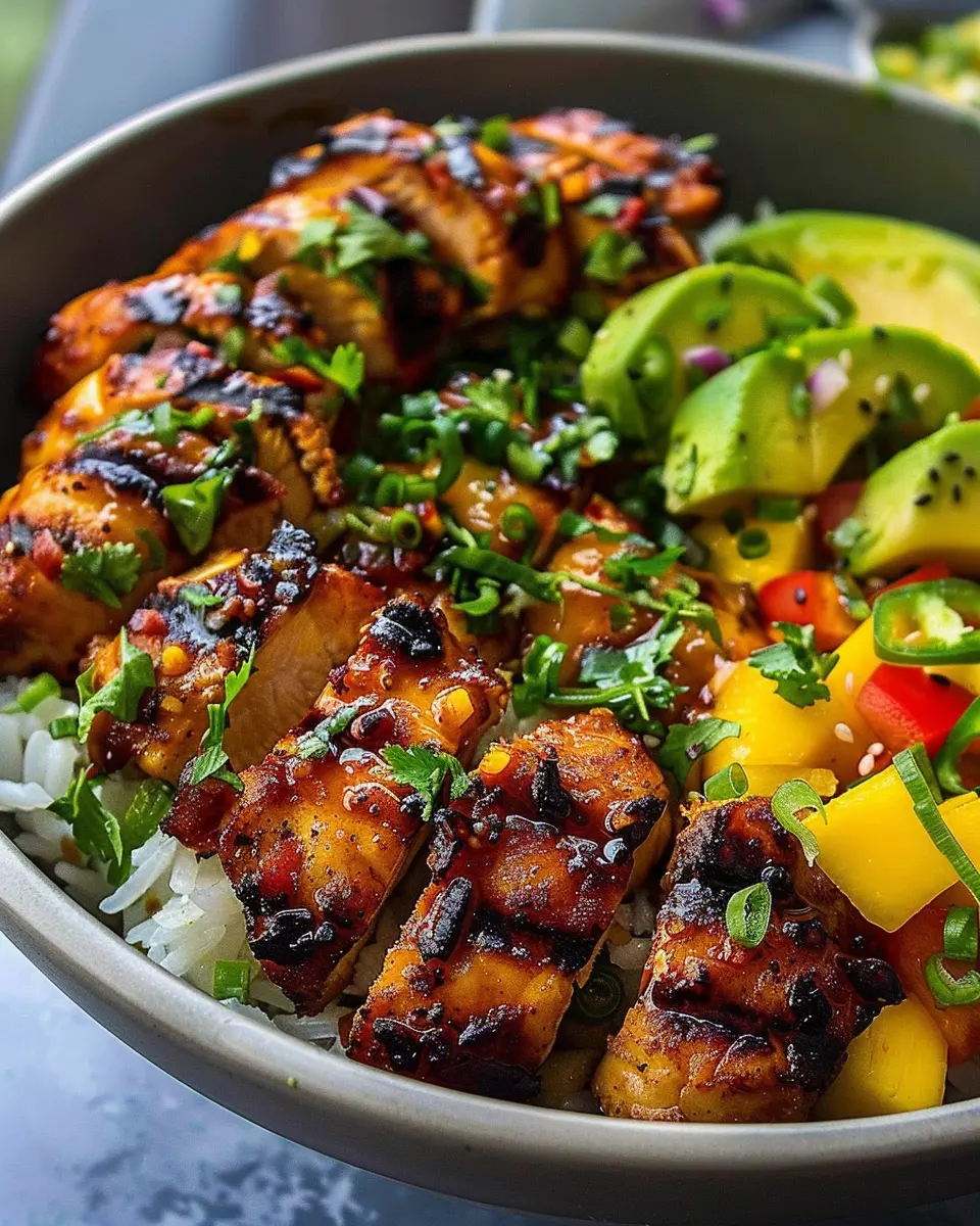 5. Assemble the bowl by adding the coconut rice, grilled chicken, and topping with mango avocado salsa.