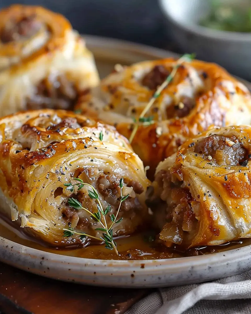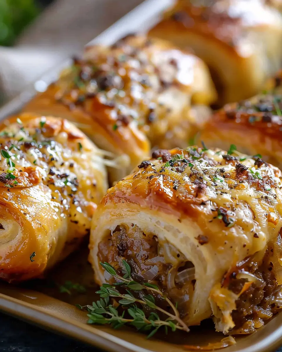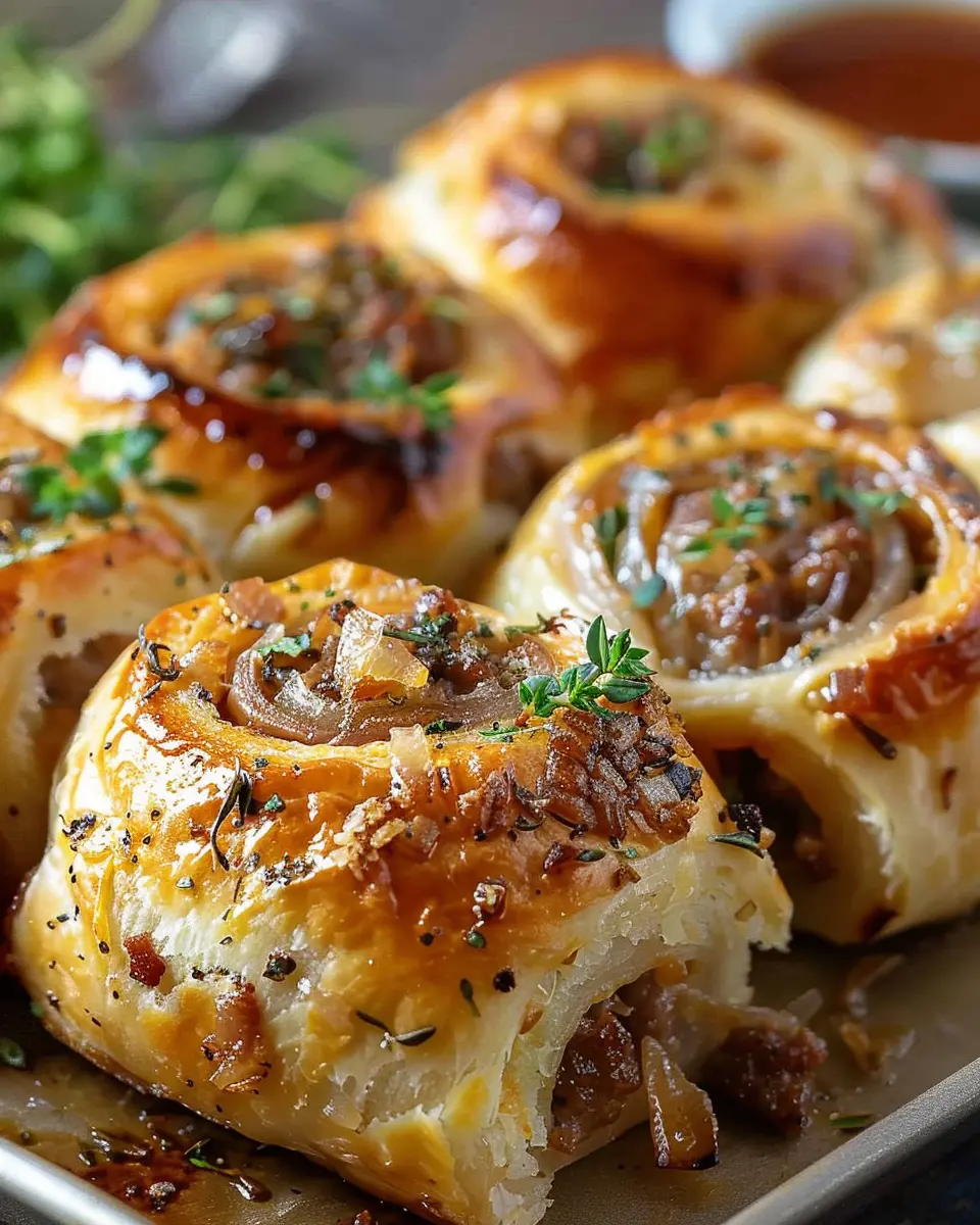 Indulge in the rich flavors of Savory French Onion Sausage Rolls, a delectable treat perfect for any occasion.