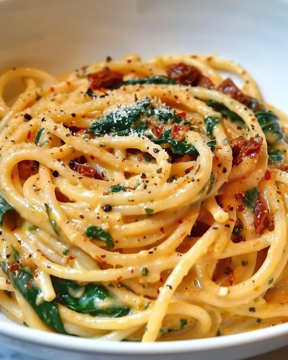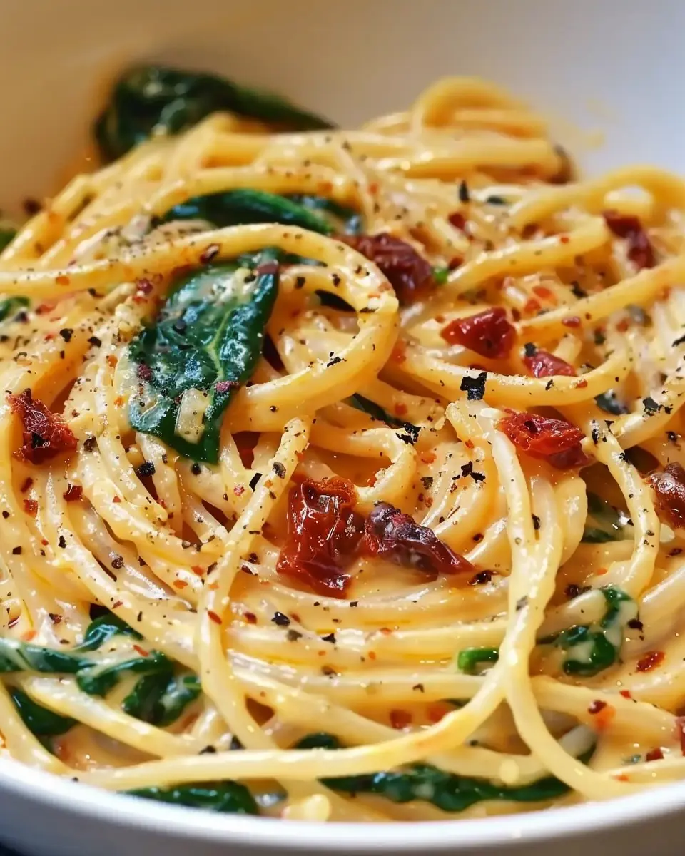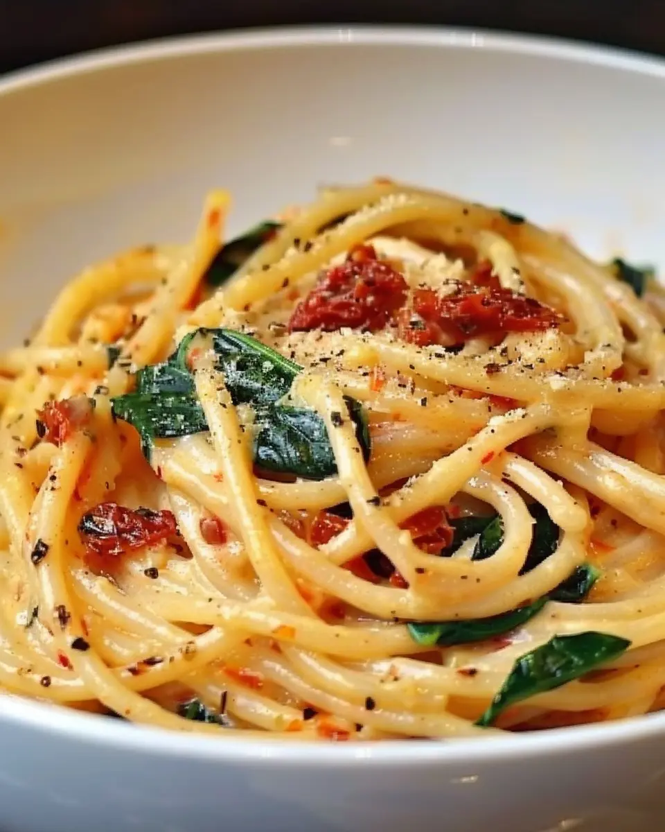 A creamy and delicious spaghetti dish with fresh spinach and sun-dried tomatoes, perfect for a quick weeknight dinner.