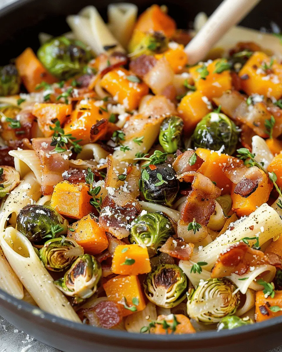 Kicking your bacon brussels sprouts butternut squash pasta up a notch is easy when you incorporate seasonal vegetables! Consider adding kale, sweet potatoes, or even caramelized onions. These not only enhance the dish’s nutritional profile but also infuse it with vibrant flavors.